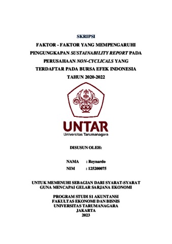 Reynardo, Reynardo (2023) FAKTOR - FAKTOR YANG MEMPENGARUHI PENGUNGKAPAN SUSTAINABILITY REPORT PADA PERUSAHAAN NON-CYCLICALS YANG TERDAFTAR PADA BURSA EFEK INDONESIA TAHUN 2020-2022. Skripsi thesis, Universitas Tarumanagara.