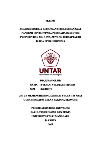 Setiyono, Stefani Velisia (2023) ANALISIS KINERJA KEUANGAN SEBELUM DAN SAAT PANDEMI COVID-19 PADA PERUSAHAAN SEKTOR PROPERTI DAN REAL ESTATE YANG TERDAFTAR DI BURSA EFEK INDONESIA. Skripsi thesis, Universitas Tarumanagara.