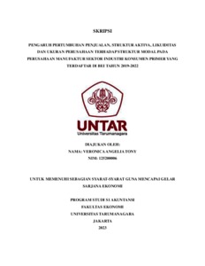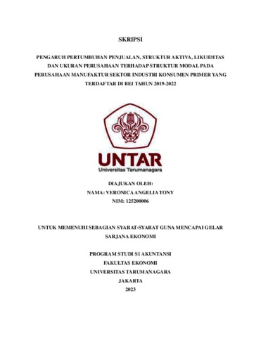 Tony, Veronica Angelia (2023) PENGARUH PERTUMBUHAN PENJUALAN, STRUKTUR AKTIVA, LIKUIDITAS DAN UKURAN PERUSAHAAN TERHADAP STRUKTUR MODAL PADA PERUSAHAAN MANUFAKTUR SEKTOR INDUSTRI KONSUMEN PRIMER YANG TERDAFTAR DI BEI TAHUN 2019-2022. Skripsi thesis, Universitas Tarumanagara.