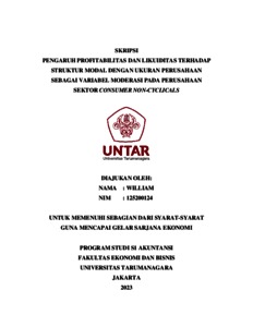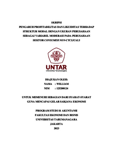 William, William (2023) PENGARUH PROFITABILITAS DAN LIKUIDITAS TERHADAP STRUKTUR MODAL DENGAN UKURAN PERUSAHAAN SEBAGAI VARIABEL MODERASI PADA PERUSAHAAN SEKTOR CONSUMER NON-CYCLICALS. Skripsi thesis, Universitas Tarumanagara.