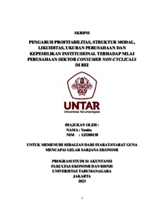 Yunita, Yunita (2023) PENGARUH PROFITABILITAS, STRUKTUR MODAL, LIKUIDITAS, UKURAN PERUSAHAAN DAN KEPEMILIKAN INSTITUSIONAL TERHADAP NILAI PERUSAHAAN SEKTOR CONSUMER NON-CYCLICALS DI BEI. Skripsi thesis, Universitas Tarumanagara.