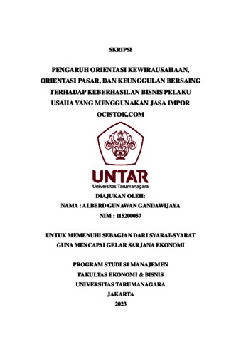 Gandawijaya, Alberd Gunawan (2023) ENGARUH ORIENTASI KEWIRAUSAHAAN, ORIENTASI PASAR, DAN KEUNGGULAN BERSAING TERHADAP KEBERHASILAN BISNIS PELAKU USAHA YANG MENGGUNAKAN JASA IMPOR OCISTOK.COM. Skripsi thesis, Universitas Tarumanagara.