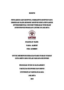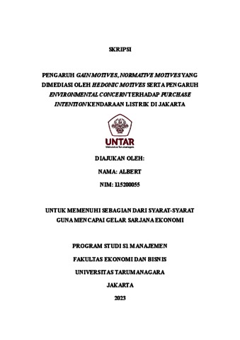 Albert, Albert (2023) PENGARUH GAIN MOTIVES, NORMATIVE MOTIVES YANG DIMEDIASI OLEH HEDONIC MOTIVES SERTA PENGARUH ENVIRONMENTAL CONCERN TERHADAP PURCHASE INTENTION KENDARAAN LISTRIK DI JAKARTA. Skripsi thesis, Universitas Tarumanagara.