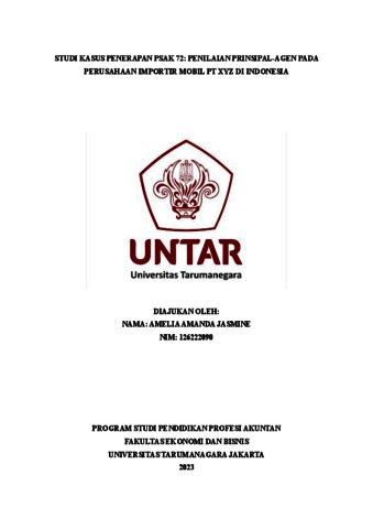 JASMINE, AMELIA AMANDA (2023) STUDI KASUS PENERAPAN PSAK 72: PENILAIAN PRINSIPAL-AGEN PADA PERUSAHAAN IMPORTIR MOBIL PT XYZ DI INDONESIA. Masters thesis, Universitas Tarumanagara.