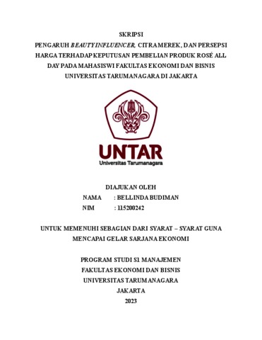 Budiman, Bellinda (2023) PENGARUH BEAUTY INFLUENCER, CITRA MEREK, DAN PERSEPSI HARGA TERHADAP KEPUTUSAN PEMBELIAN PRODUK ROSÉ ALL DAY PADA MAHASISWI FAKULTAS EKONOMI DAN BISNIS UNIVERSITAS TARUMANAGARA DI JAKARTA. Skripsi thesis, Universitas Tarumanagara.