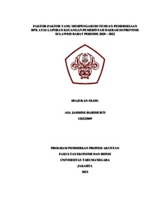 HARIMURTI, ASA JASMINE (2023) FAKTOR-FAKTOR YANG MEMPENGARUHI TEMUAN PEMERIKSAAN BPK ATAS LAPORAN KEUANGAN PEMERINTAH DAERAH DI PROVINSI SULAWESI BARAT PERIODE 2020 – 2022. Masters thesis, Universitas Tarumanagara.
