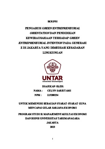 Sariutami, Celyn (2023) PENGARUH GREEN ENTREPRENEURIAL ORIENTATION DAN PENDIDIKAN KEWIRAUSAHAAN TERHADAP GREEN ENTREPRENEURIAL INTENTION PADA GENERASI Z DI JAKARTA YANG DIMEDIASI KESADARAN LINGKUNGAN. Skripsi thesis, Universitas Tarumanagara.