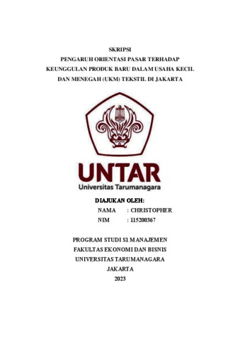 Christopher, Christopher (2023) PENGARUH ORIENTASI PASAR TERHADAP KEUNGGULAN PRODUK BARU DALAM USAHA KECIL DAN MENEGAH (UKM) TEKSTIL DI JAKARTA. Skripsi thesis, Universitas Tarumanagara.