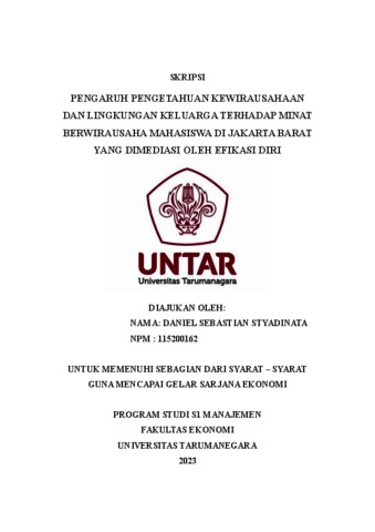 (E) Abstrak: Skripsi ini mengkaji pengaruh pengetahuan kewirausahaan dan lingkungan keluarga terhadap minat berwirausaha di kalangan mahasiswa Universitas Jakarta Barat, dengan peran mediasi efikasi diri. Metodologi yang digunakan adalah kuantitatif deskriptif. Hasil penelitian menunjukkan bahwa pengetahuan kewirausahaan berdampak positif dan signifikan terhadap minat berwirausaha serta efikasi diri mahasiswa. Sementara itu, lingkungan keluarga tidak secara langsung mempengaruhi minat berwirausaha, namun memiliki pengaruh signifikan terhadap efikasi diri. Efikasi diri terbukti memediasi hubungan antara pengetahuan kewirausahaan dan lingkungan keluarga dengan minat berwirausaha. Kesimpulan ini memberikan wawasan baru tentang faktor-faktor yang mempengaruhi minat berwirausaha di kalangan mahasiswa, menekankan pentingnya pengetahuan kewirausahaan dan efikasi diri. Kata kunci: pengetahuan kewirausahaan, lingkungan keluarga, efikasi diri, minat berwirausaha.