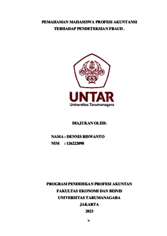 RISWANTO, DENNIS (2023) PEMAHAMAN MAHASISWA PROFESI AKUNTANSI TERHADAP PENDETEKSIAN FRAUD. Masters thesis, Universitas Tarumanagara.