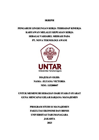 Victoria, Elyana (2023) PENGARUH LINGKUNGAN KERJA TERHADAP KINERJA KARYAWAN MELALUI KEPUASAN KERJA SEBAGAI VARIABEL MEDIASI PADA PT. NOVA TEKNOLOGI AWANI. Skripsi thesis, Universitas Tarumanagara.