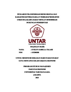 Talahi, Evelyn Sabella (2023) PENGARUH TRANSFORMASI BISNIS DIGITAL DAN KARAKTER KEWIRAUSAHAAN TERHADAP RESILIENSI UMKM DI JAKARTA BARAT DENGAN DIMODERASI DUKUNGAN PEMERINTAH. Skripsi thesis, Universitas Tarumanagara.