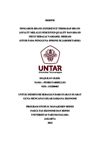 Farrellio, Fiore (2023) PENGARUH BRAND EXPERIENCE TERHADAP BRAND LOYALTY MELALUI PERCEIVED QUALITY DAN BRAND TRUST SEBAGAI VARIABEL MEDIASI (STUDI PADA PENGGUNA IPHONE DI JABODETABEK). Skripsi thesis, Universitas Tarumanagara.