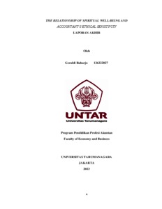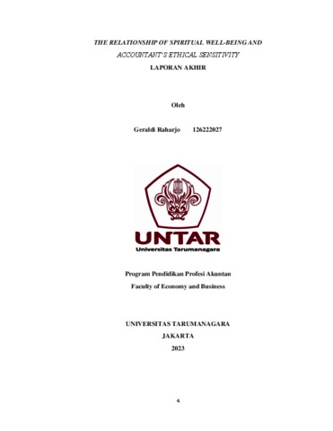 RAHARJO, GERALDI (2023) THE RELATIONSHIP OF SPIRITUAL WELL-BEING AND ACCOUNTANT’S ETHICAL SENSITIVITY LAPORAN AKHIR. Masters thesis, Universitas Tarumanagara.