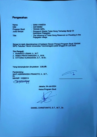 Vanesa, Gina (2024) Pengaruh waduk teluk gong terhadap banjir di kelurahan pejagalan (TS - 2629). Skripsi thesis, Universitas Tarumanagara.