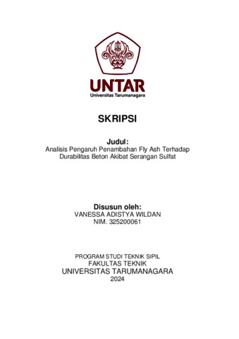 Wildan, Vanessa Adistya (2024) Analisis pengaruh penambahan fly ash terhadap durabilitas beton akibat serangan sulfat (TS - 2643). Skripsi thesis, Universitas Tarumanagara.