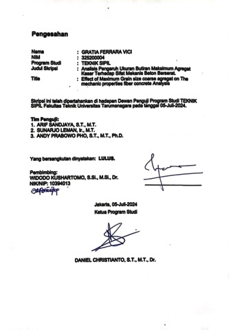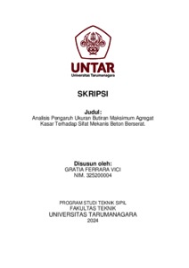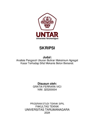 Vici, Gratia Ferrara (2024) Analisis pengaruh ukuran butiran maksimum agregat kasar terhadap sifat mekanis beton berserat (TS - 2644). Skripsi thesis, Universitas Tarumanagara.