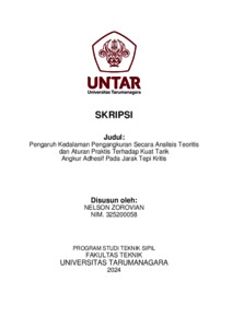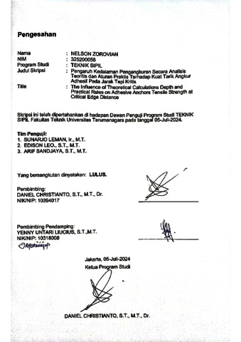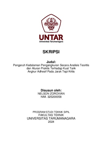 Zorovian, Nelson (2024) Pengaruh kedalaman pengangkuran secara analisis teoritis dan aturan praktis terhadap kuat tarik angkur adhesif pada jarak tepi kritis (TS - 2647). Skripsi thesis, Universitas Tarumanagara.