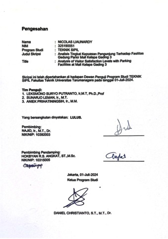 Liaunardy, Nicolas (2024) Analisis tingkat kepuasan pengunjung terhadap fasilitas gedung parkir mall kelapa gading 3 (TS - 2648). Skripsi thesis, Universitas Tarumanagara.