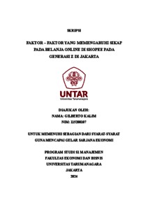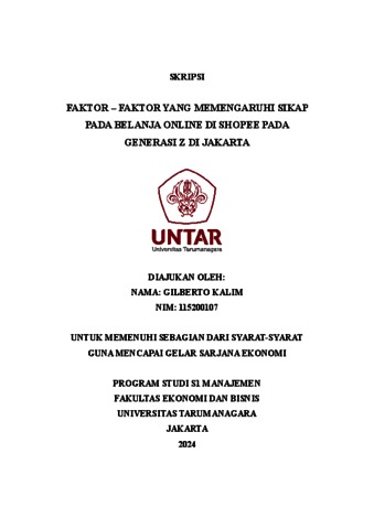 Kalim, Gilberto (2023) FAKTOR – FAKTOR YANG MEMENGARUHI SIKAP PADA BELANJA ONLINE DI SHOPEE PADA GENERASI Z DI JAKARTA. Skripsi thesis, Universitas Tarumanagara.