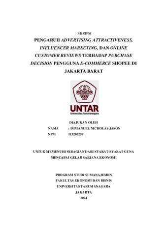 Jason, Immanuel Nicholas (2023) PENGARUH ADVERTISING ATTRACTIVENESS, INFLUENCER MARKETING, DAN ONLINE CUSTOMER REVIEWS TERHADAP PURCHASE DECISION PENGGUNA E-COMMERCE SHOPEE DI JAKARTA BARAT. Skripsi thesis, Universitas Tarumanagara.