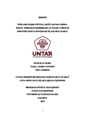Antonio, James (2023) PENGARUH KREATIVITAS, MOTIVASI DAN MEDIA SOSIAL TERHADAP KEBERHASILAN USAHA UMKM DI INDUSTRI FOOD & BEVERAGES DI JAKARTA BARAT. Skripsi thesis, Universitas Tarumanagara.