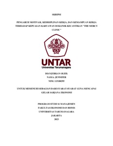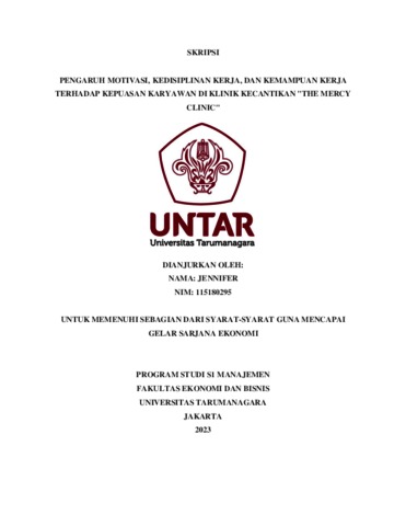 Jennifer, Jennifer (2023) PENGARUH MOTIVASI, KEDISIPLINAN KERJA, DAN KEMAMPUAN KERJA TERHADAP KEPUASAN KARYAWAN DI KLINIK KECANTIKAN "THE MERCY CLINIC". Skripsi thesis, Universitas Tarumanagara.
