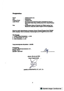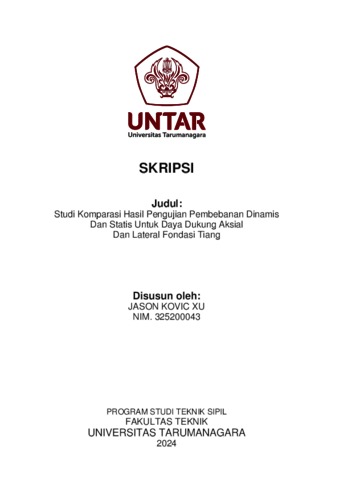 Xu, Jason Kovic (2024) Studi komparasi hasil pengujian pembebanan dinamis dan statis untuk daya dukung aksial dan lateral fondasi tiang (TS - 2657). Skripsi thesis, Universitas Tarumanagara.