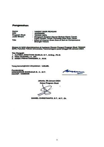 Reagan, Vikent Dior (2024) Pengaruh gradasi ukuran butiran kasar tanah pada contoh tanah terhadap nilai kuat tekan (TS - 2667). Skripsi thesis, Universitas Tarumanagara.