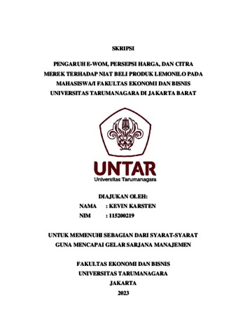 Karsten, Kevin (2023) PENGARUH E-WOM, PERSEPSI HARGA, DAN CITRA MEREK TERHADAP NIAT BELI PRODUK LEMONILO PADA MAHASISWA/I FAKULTAS EKONOMI DAN BISNIS UNIVERSITAS TARUMANAGARA DI JAKARTA BARAT. Skripsi thesis, Universitas Tarumanagara.