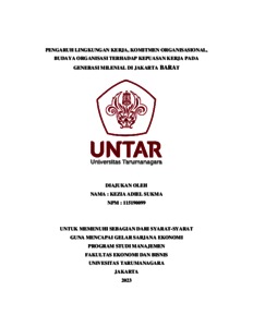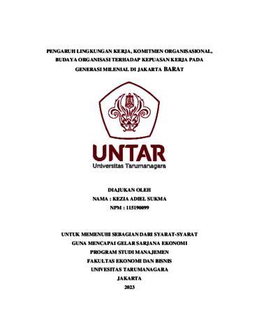 Sukma, Kezia Adiel (2023) PENGARUH LINGKUNGAN KERJA, KOMITMEN ORGANISASIONAL, BUDAYA ORGANISASI TERHADAP KEPUASAN KERJA PADA GENERASI MILENIAL DI JAKARTA BARAT. Skripsi thesis, Universitas Tarumanagara.