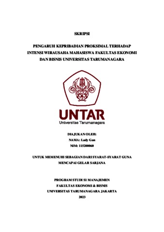 Gan, Lady (2023) PENGARUH KEPRIBADIAN PROKSIMAL TERHADAP INTENSI WIRAUSAHA MAHASISWA FAKULTAS EKONOMI DAN BISNIS UNIVERSITAS TARUMANAGARA. Skripsi thesis, Universitas Tarumanagara.