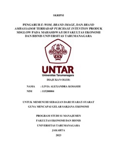 Kosasih, Livia Alexandra (2023) PENGARUH E-WOM, BRAND IMAGE, DAN BRAND AMBASSADOR TERHADAP PURCHASE INTENTION PRODUK MSGLOW PADA MAHASISWA/I DI FAKULTAS EKONOMI DAN BISNIS UNIVERSITAS TARUMANAGARA. Skripsi thesis, Universitas Tarumanagara.