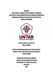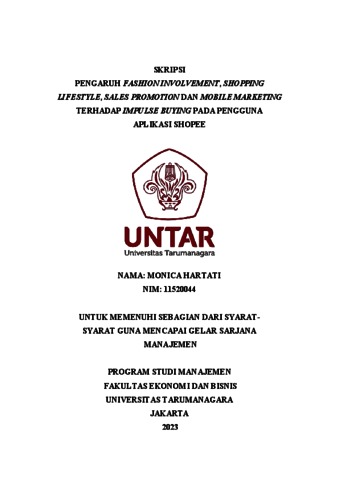 Hartati, Monica (2023) PENGARUH FASHION INVOLVEMENT, SHOPPING LIFESTYLE, SALES PROMOTION DAN MOBILE MARKETING TERHADAP IMPULSE BUYING PADA PENGGUNA APLIKASI SHOPEE. Skripsi thesis, Universitas Tarumanagara.