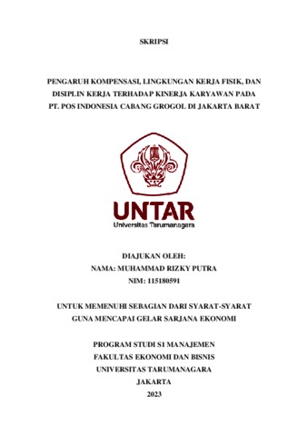 Putra, Muhammad Rizky (2023) PENGARUH KOMPENSASI, LINGKUNGAN KERJA FISIK, DAN DISIPLIN KERJA TERHADAP KINERJA KARYAWAN PADA PT. POS INDONESIA CABANG GROGOL DI JAKARTA BARAT. Skripsi thesis, Universitas Tarumanagara.