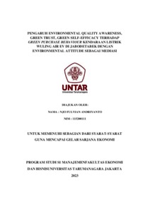 Andriyanto, Njo Fulvian (2023) PENGARUH ENVIRONMENTAL QUALITY AWARENESS, GREEN TRUST, GREEN SELF-EFFICACY TERHADAP GREEN PURCHASE BEHAVIOUR KENDARAAN LISTRIK WULING AIR EV DI JABODETABEK DENGAN ENVIRONMENTAL ATTITUDE SEBAGAI MEDIASI. Skripsi thesis, Universitas Tarumanagara.