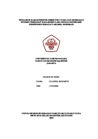Sugiarto, Claudia (2023) Pengaruh karakteristik direktur utama dan kebijakan dividen terhadap manajemen laba dengan komisaris independen sebagai variabel moderasi. Masters thesis, Universitas Tarumanagra.