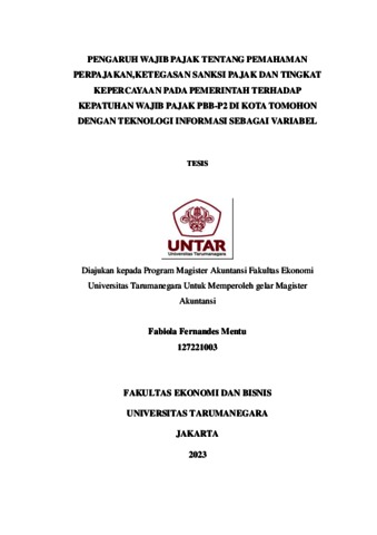 Mentu, Fabiola Fernandes (2023) Pengarfuh wajib pajak tentang pemahaman pepajakan, ketegasan sanksi pajak dan tngkat kepercayaan pada Pemerintah terhadap kepatuhan wajib pajak PBB-P2 dikota Tomohon dengan teknologi informasi sebagai variabel. Masters thesis, Universitas Tarumanagra.