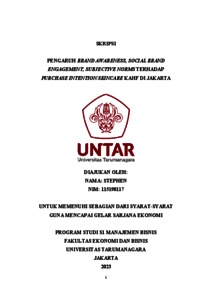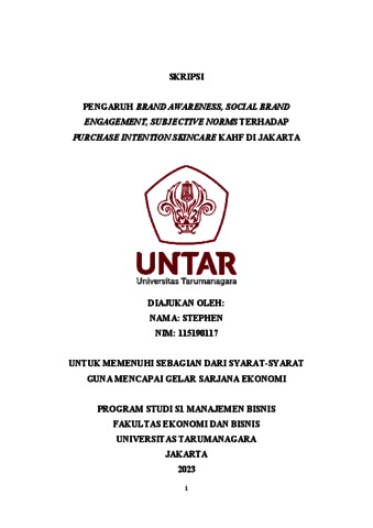 Stephen, Stephen (2023) PENGARUH BRAND AWARENESS, SOCIAL BRAND ENGAGEMENT, SUBJECTIVE NORMS TERHADAP PURCHASE INTENTION SKINCARE KAHF DI JAKARTA. Skripsi thesis, Universitas Tarumanagara.