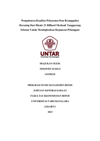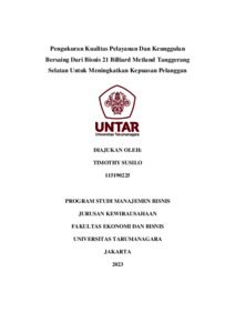 Susilo, Timothy (2023) Pengukuran Kualitas Pelayanan Dan Keunggulan Bersaing Dari Bisnis 21 Billiard Metland Tanggerang Selatan Untuk Meningkatkan Kepuasan Pelanggan. Skripsi thesis, Universitas Tarumanagara.