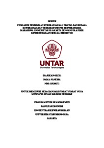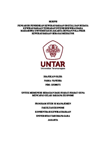 Vanessa, Vanessa (2023) PENGARUH PENDIDIKAN KEWIRAUSAHAAN DIGITAL DAN BUDAYA KEWIRAUSAHAAN TERHADAP INTENSI BERWIRAUSAHA MAHASISWA UNIVERSITAS DI JAKARTA DENGAN POLA PIKIR KEWIRAUSAHAAN SEBAGAI MEDIATOR. Skripsi thesis, Universitas Tarumanagara.