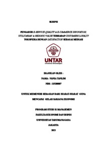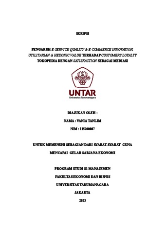 Tanlim, Vania (2023) PENGARUH E-SERVICE QUALITY & E-COMMERCE INNOVATION, UTILITARIAN & HEDONIC VALUE TERHADAP CUSTOMERS LOYALTY TOKOPEDIA DENGAN SATISFACTION SEBAGAI MEDIASI. Skripsi thesis, Universitas Tarumanagara.