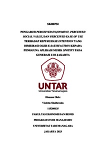 Shalbrenda, Violetta (2023) PENGARUH PERCEIVED ENJOYMENT, PERCEIVED SOCIAL VALUE, DAN PERCEIVED EASE OF USE TERHADAP REPURCHASE INTENTION YANG DIMEDIASI OLEH E-SATISFACTION KEPADA PENGGUNA APLIKASI MUSIK SPOTIFY PADA GENERASI Z DI JAKARTA. Skripsi thesis, Universitas Tarumanagara.