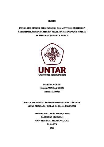 Soon, Winday (2023) PENGARUH EFIKASI DIRI, INOVASI, DAN MOTIVASI TERHADAP KEBERHASILAN USAHA MIKRO, KECIL, DAN MENENGAH (UMKM) DI WILAYAH JAKARTA BARAT. Skripsi thesis, Universitas Tarumanagara.
