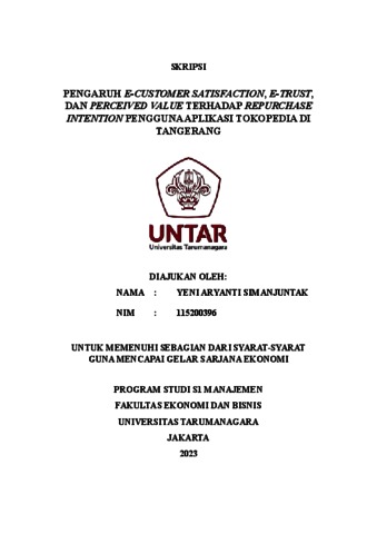 Simanjuntak, Yeni Aryanti (2023) PENGARUH E-CUSTOMER SATISFACTION, E-TRUST, DAN PERCEIVED VALUE TERHADAP REPURCHASE INTENTION PENGGUNA APLIKASI TOKOPEDIA DI TANGERANG. Skripsi thesis, Universitas Tarumanagara.