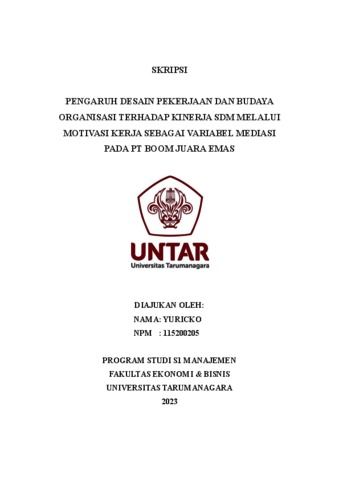 Yuricko, Yuricko (2023) PENGARUH DESAIN PEKERJAAN DAN BUDAYA ORGANISASI TERHADAP KINERJA SDM MELALUI MOTIVASI KERJA SEBAGAI VARIABEL MEDIASI PADA PT BOOM JUARA EMAS. Skripsi thesis, Universitas Tarumanagara.