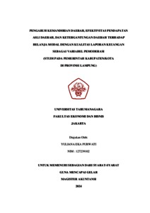 Purwati, Yuliana Eka (2023) Pengaruh kemandirian daerah, efektifitas pendapatan asli daerah, dan ketergantungan daerah terhadap belanja modal dengan kualitas laporan keuangan sebagai variabel pemoderasi (studi pada pemerintah kabupaten/kota di Provinsi Lampung). Masters thesis, Universitas Tarumanagra.