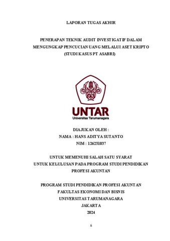 Sutanto, Hans Aditya (2023) Penerapan teknik audit investigasi dalam mengungkap pencucian uang melalui aset kripto (studi kasus PT ASABRI). Masters thesis, Universitas Tarumanagara.
