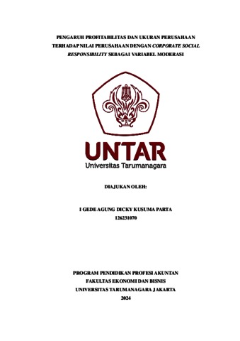 Parta, I Gede Agung Dicky Kusuma (2023) Pengaruh profitabilitas dan ukuran perusahaan terhadap nilai perusahaan dengan corporate social responsibility sebagai variabel moderasi. Masters thesis, Universitas Tarumanagara.