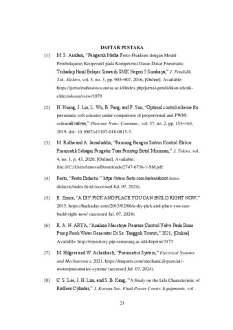 Penelitian ini bertujuan untuk merancang sistem pneumatik dengan multi speed control pada unit transfer linear pick and place. Sistem ini dirancang untuk meningkatkan efisiensi dan akurasi dalam proses pengambilan dan penempatan komponen di jalur produksi. Transfer unit linear pick and place yang efektif sangat penting dalam aplikasi industri yang memerlukan penanganan material yang cepat dan presisi. Dalam perancangan ini, digunakan komponen utama seperti silinder pneumatik, rodless cylinder, katup solenoid, pengontrol logika terprogram (PLC), dan sensor posisi. Sistem multi-speed control memungkinkan silinder untuk bergerak dengan kecepatan yang bervariasi pada tahap yang berbeda dari siklus kerja, yang memberikan fleksibilitas dan optimalisasi waktu siklus. Misalnya, kecepatan tinggi digunakan untuk pergerakan awal dan kecepatan rendah untuk penempatan akhir yang presisi. Sistem yang dirancang juga menunjukkan keandalan yang tinggi dan mudah dalam perawatan. Implementasi sistem ini diharapkan dapat memberikan manfaat signifikan dalam aplikasi industri yang memerlukan otomatisasi pick and place yang cepat dan akurat, seperti dalam industri elektronik, otomotif, dan pengemasan. Penelitian ini menyimpulkan bahwa penggunaan sistem pneumatik dengan multi speed control pada transfer unit linear pick and place adalah solusi yang efisien dan efektif untuk meningkatkan produktivitas dan kualitas produksi.